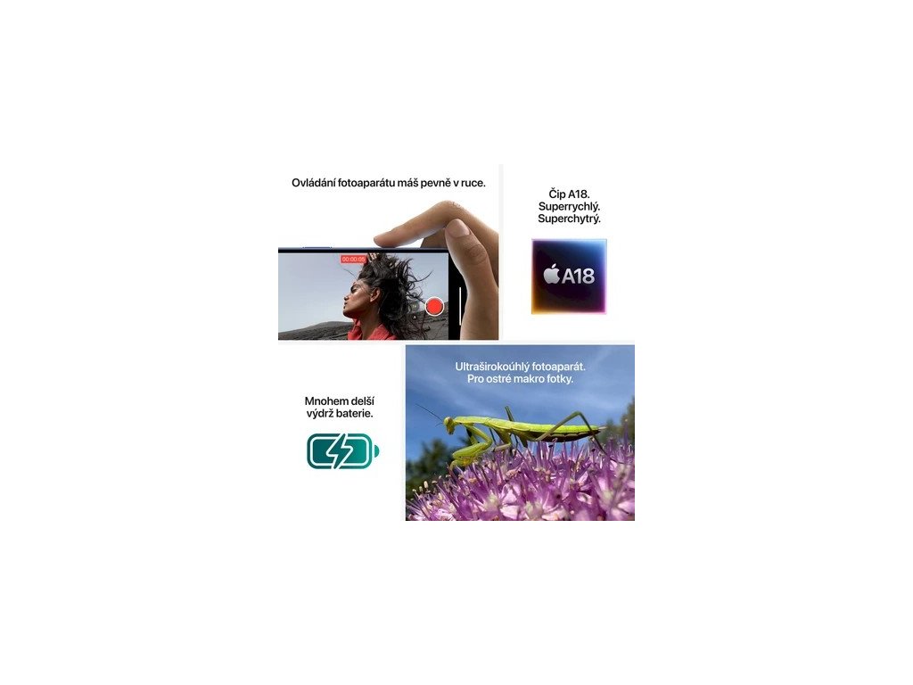 Speciálně navržený čip A18 přeskočil A16 Bionic v iPhonu 15 o dvě generace. Podporuje pokročilejší fotografické a video funkce, jako jsou fotografické styly nebo Ovládání fotoaparátu. A jeho mimořádná energetická úspornost prodlužuje výdrž baterie.