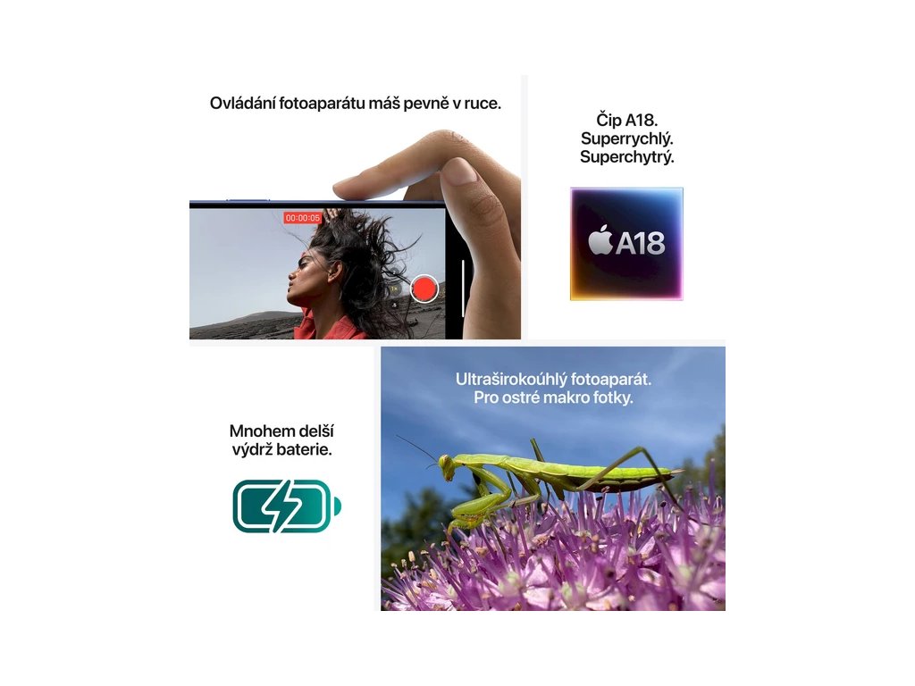 Speciálně navržený čip A18 přeskočil A16 Bionic v iPhonu 15 o dvě generace. Podporuje pokročilejší fotografické a video funkce, jako jsou fotografické styly nebo Ovládání fotoaparátu. A jeho mimořádná energetická úspornost prodlužuje výdrž baterie.