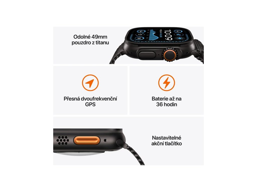 Apple Watch Ultra 2 jsou vyrobeny pro bezkonkurenční výkon. Lehké titanové tělo je robustní a odolné proti korozi a je vyvýšené, aby chránilo safírové sklíčko před nárazy hran.